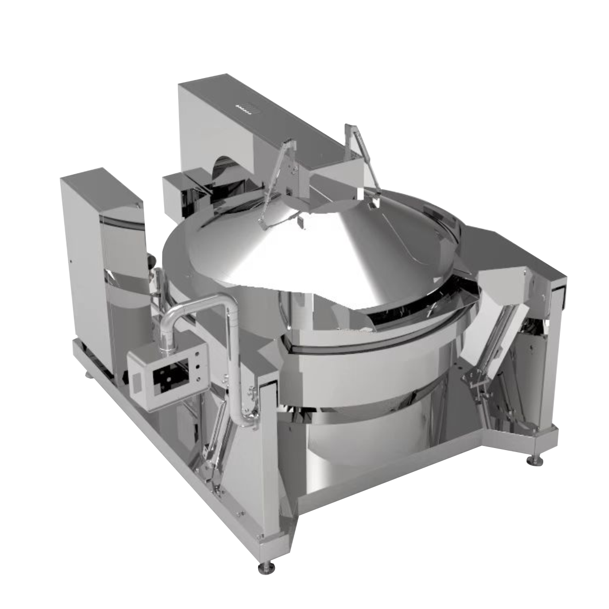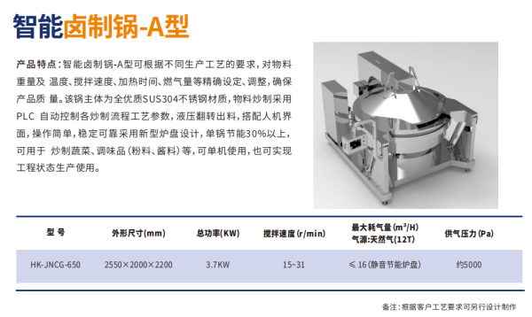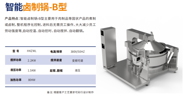 主要?于?制品等固狀產(chǎn)品的煮制或?制,整機(jī)程序化控制,進(jìn)料后?需員?操作,??減少員?勞動(dòng)強(qiáng)度等,?動(dòng)控溫、?動(dòng)控時(shí)、?動(dòng)攪拌、?動(dòng)翻鍋。